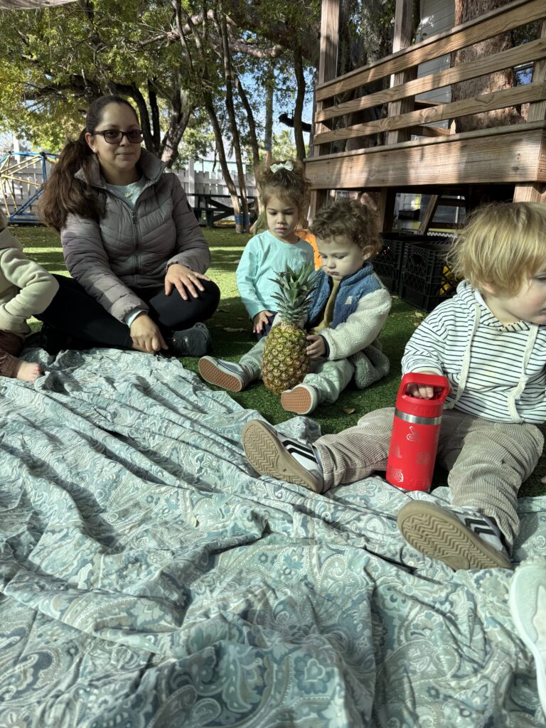 3. Pigeon Plum friends explore a pineapple during daily circle