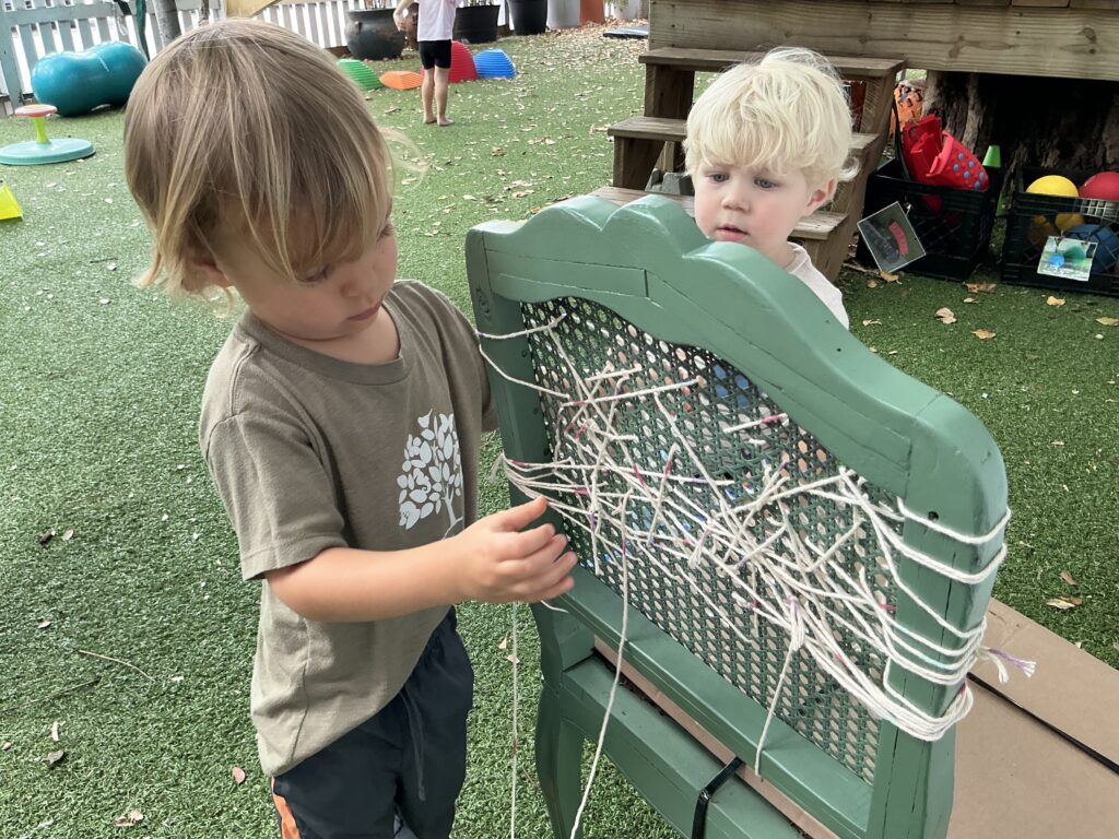 1. Pigeon Plum Toddler friends begin work on their art auction project by weaving the back of a chair